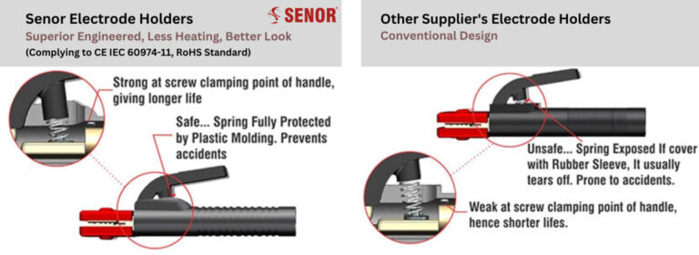 Senor electrode holders are designed in line with IEC 60974-11, along with CE and RoHS standards—making them suitable for demanding industrial environments.